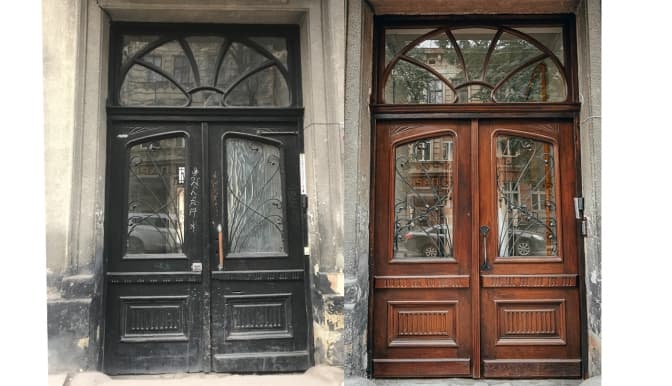 В цьому будинку це вже другі двері, які мешканці відновили в рамках міської програми співфінансування. Ці двері фахівці повністю розібрали і зібрали заново, вони були скручені. «Дубова коробка була погано закріплена у стіні, що негативно впливало на відкривання дверей. Тому мешканці користувалися, в основному, тільки правою частиною дверей. В процесі ремонту були відрегульовані автентичні завіси та міцно закріплена дверна коробка», – йдеться у повідомленні.