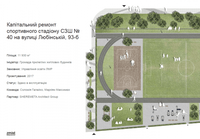 Стадіон школи № 40, що на вулиці Любінській, 93 Б вдалось відновити завдяки громадському бюджету та активності мешканців. Активіст та голова ГО «Інститут розвитку», Володимир Баб’як каже, що територія де розміщений стадіон є болотяниста, а відведення надлишку води до загальноміської каналізації з технічних причин виявилось неможливим. Так з’явилася ідея використання біодренажів – заглиблень у ґрунті, що пошарово заповнюються піскосумішшю, геоволокном та щебенем, утворюючи таким чином в рази кращу за проникністю поверхню, що дозволяє швидко поглинати дощівку та затримувати її в екосистемі.