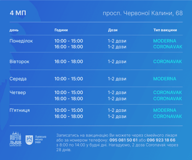 Записатись на вакцинацію можна у системі Helsi в розділі «Запис на вакцинацію». Мешканцям також нагадують, що можна записатись на вакцинацію у стаціонарний пункт. Наприклад, можна за номером телефону (кожен пункт вакцинації має свій телефонний номер, з якими можна ознайомитись нижче в інфографіках), у свого сімейного лікаря або в електронній системі Helsi.