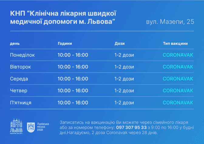 Графік роботи центрів масової вакцинації 6-10 вересня