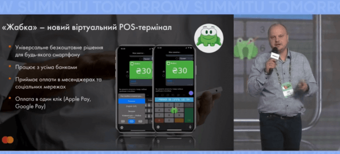 «Для цього ми придумали для підприємців «Жабку», за допомогою якої оплату можна приймати через різні соціальні мережі. Всього за декілька секунд у смартфоні може з’явитися зручний банківський термінал для платежів. Потрібно вказати бажану ціну за товар чи послугу, а програма автоматично сформує зручний рахунок для покупця», – пояснює спікер.