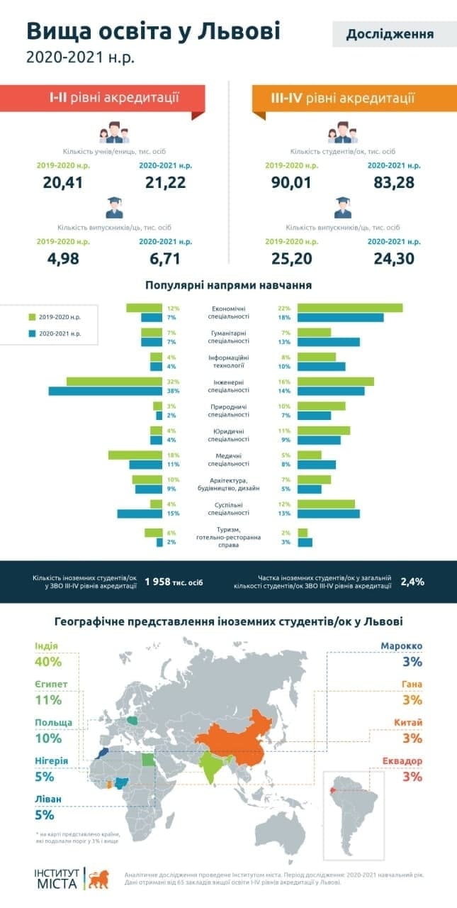 Щороку Львів стає все більш привабливим для іноземних студентів та вперше станом на 2020-2021 їхня частка перевищила поріг у 2% від загальної кількості студентства у закладах вищої освіти III-IV рівнів акредитації. Йдеться про 1 958 людей. Відповідні результати дослідження оприлюдинили в КУ Інститут міста.
