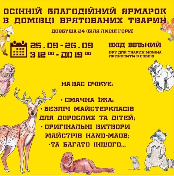 Сьогодні та завтра, 25 та 26 вересня, у Львові у Домівці врятованих тварин, що на вул. Олекси Довбуша, 24, проведуть осінній благодійний ярмарок, йдеться на їхній сторінці.