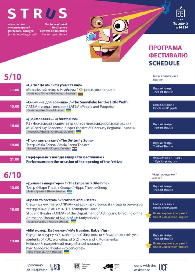 Уже наступного тижня, 5 жовтня, стартує Міжнародний мультижанровий фестиваль-конкурс для молодої аудиторії «СТРУС». Він триватиме п’ять днів і представить зразки сучасного сценічного мистецтва як України, так і закордоння в різних жанрах, формах, видах та стилях (драматичні вистави, театр ляльок, мюзикл, цирк, перформанс, пантоміма, тіньовий театр, бейбі-театр тощо).