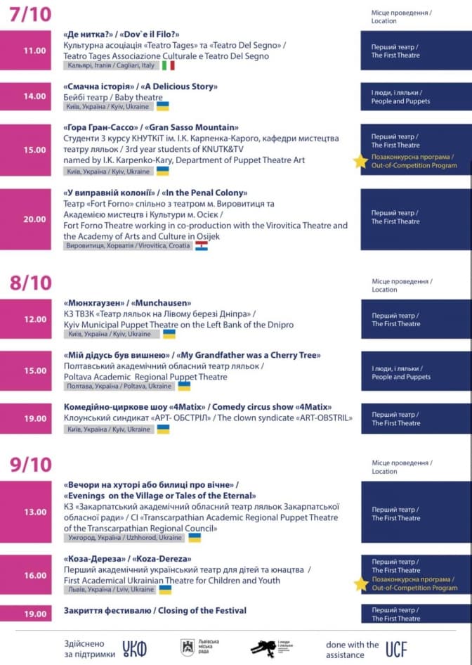Фестиваль у Львові проходитиме на двох різних локаціях: сцена Першого театру та сцена театру «І люди і ляльки». Програма передбачає дві частини програми: конкурсна (змагатимуться професійні театри) та позаконкурсна (можливість участі як професійних так і аматорських театрів).