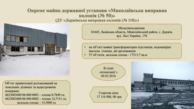 Мін’юст планує продати Миколаївську виправну колонію №50, що у селі Заклад Стрийського району. Територію площею 15,5 га хочуть виручити на торгах за початковою вартістю більше 17 млн грн. Про це повідомив у Facebook міністр юстиції Денис Малюська.
