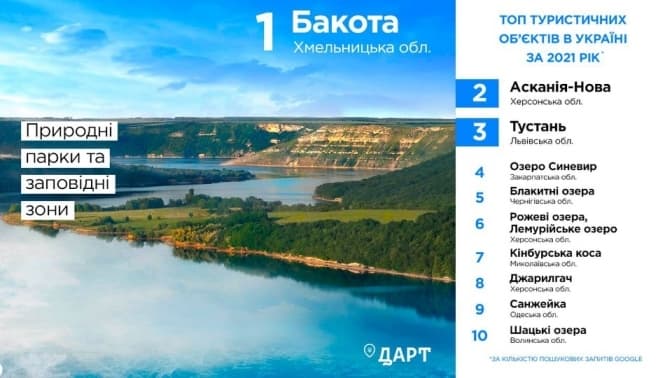 У першу п’ятірку запитів серед природних парків та заповідних зон потрапили Бакота, Асканія-Нова, Тустань, що на Львівщині, Синевир та Блакитні озера.