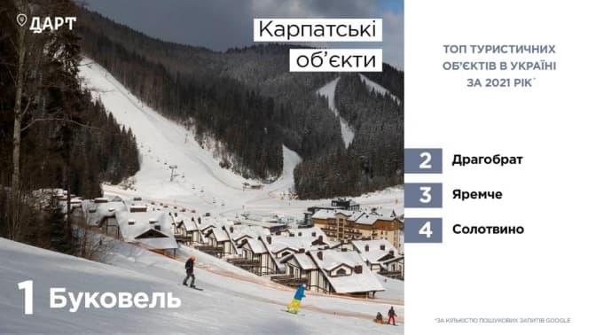 Заповідник «Тустань», львівський парк «Високий замок», база відпочинку «Бухта Вікінгів», а також Карпатські об’єкти Буковель, Драгобрат, Яремче, Солотвино увійшли до топ-туристичних об’єктів, місць та напрямків в Україні за кількістю пошукових запитів Google-Maps&Search за дев'ять місяців 2021 року. Такі дані наводить Державне агенство розвитку туризму.