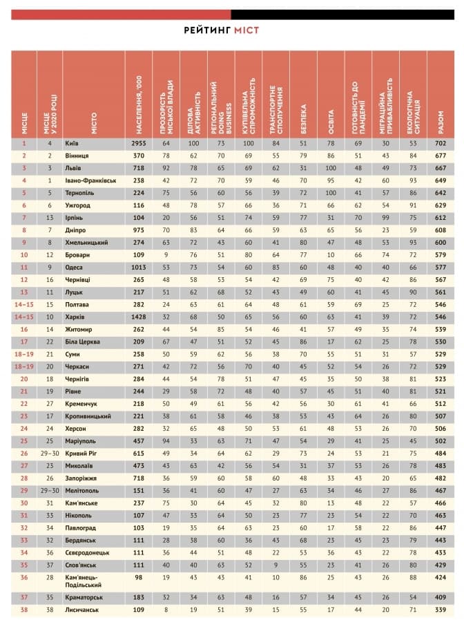 Лідером став Київ, який піднявся з минулорічної четвертої позиції. На другому місці опинилася Вінниця. Львів, як і минулого року, залишився третім – розвитком міста задоволені 56% населення. Натомість Івано-Франківськ, який торік займав перше місце, став четвертим.