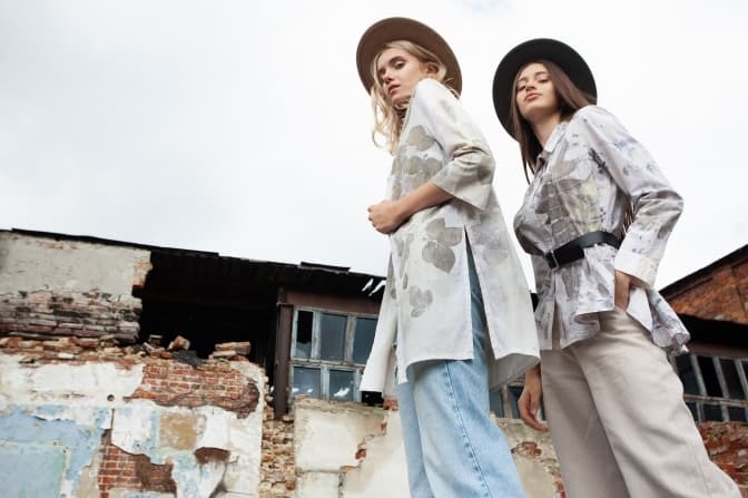 Мімікрія – це про контакт з природою та про справжність принта: білі сорочки фарбовані рослинами в техніці, що існує століттями – пігменти з рослини залишаються на тканині шляхом трикратної термообробки. Усі речі дизайнерка Богдана Войтенко принтує власноруч.