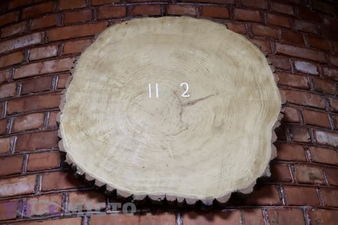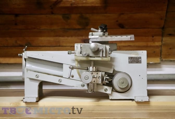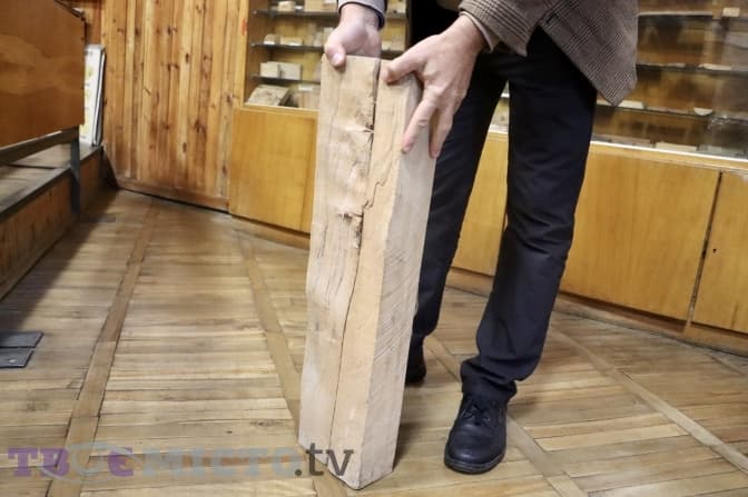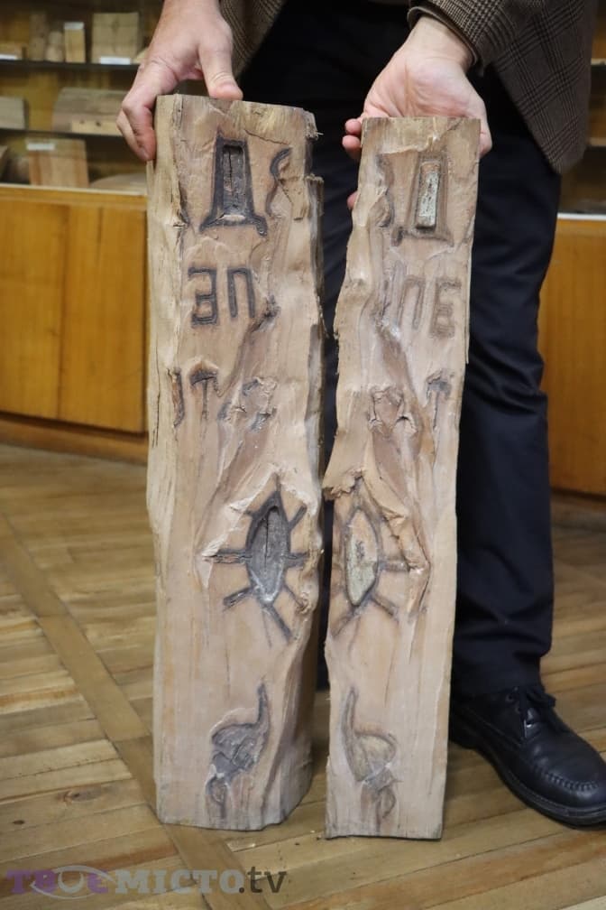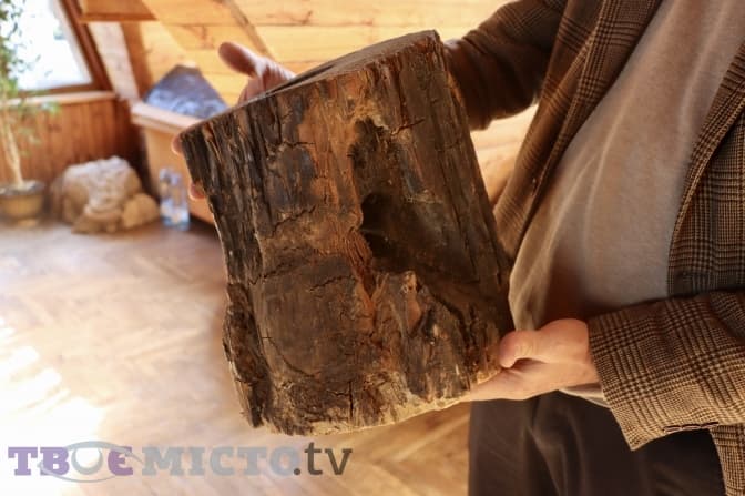 Пан Леонід знімає зі стенду ще один цікавий взірець деревини: «В стовбурі деревини знайшли написи. Дерево заросло і ми отримали зворотній малюнок. Коли ми його розколювали, то побачили надписи».
