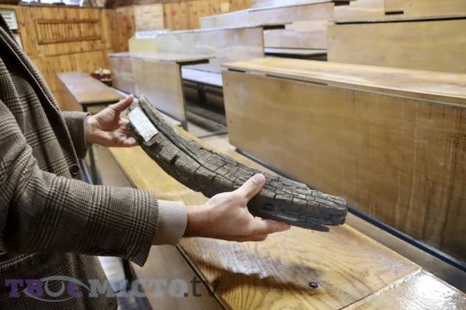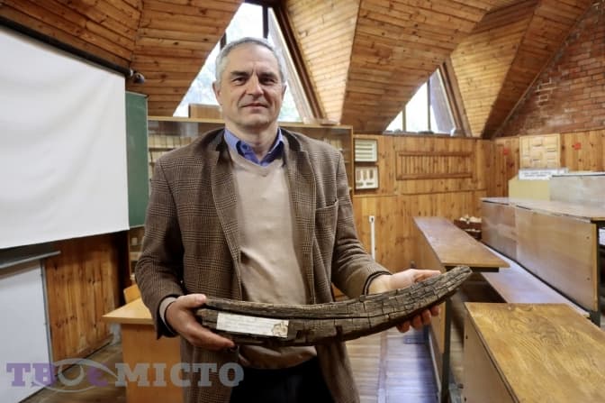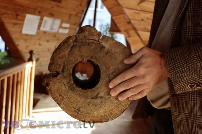 Леонід Осадчук показує ще один цікавий експонат музею – фрагмент львівського трубопроводу, який знайшли у центрі під час ремонтних робіт.