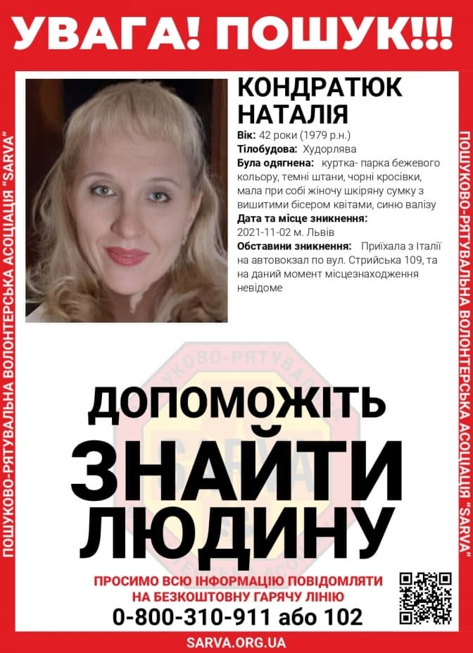 У Львові розшукують 42-річну Наталію Кондратюк, яка 2 листопада повернулася з Італії на автовокзал, що на вул. Стрийській, 109, та більше не виходила на зв’язок. Про це повідомили у пошуково-рятувальній волонтерській асоціації Sarva.