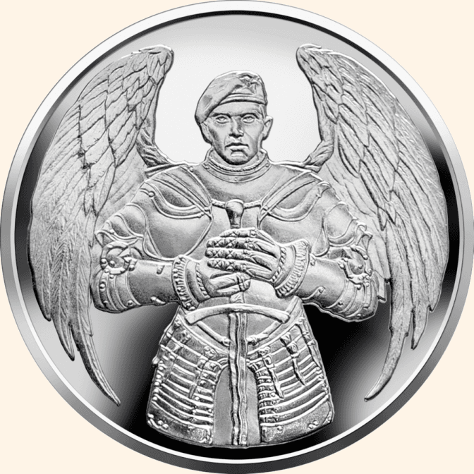 На реверсі на дзеркальному тлі зображено символічний образ воїна-десантника в лицарських обладунках, за спиною якого напіврозкриті крила – символ покровителя війська – Архангела Михаїла. Художник – Андрій Єрмоленко, а скульптори– Володимир Атаманчук та Анатолій Демяненко.