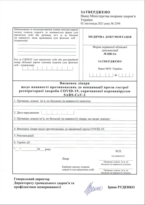 В Україні затвердили форму довідки, яку лікарі видаватимуть пацієнтам, що мають тимчасові або постійні протипоказання до вакцинації від коронавірусу. Відповідну форму № 028-1/о «Висновок лікаря щодо наявності протипоказань до вакцинації проти гострої респіраторної хвороби Covid-19, спричиненої коронавірусом SARS-CoV-2» та інструкцію про її заgовнення затвердили наказом МОЗ № 2394.