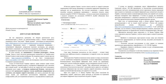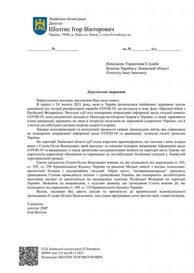 «Завдяки цілеспрямованій та методичній діяльності певних громадських діячів, яка спрямована на поширення неправдивої інформації щодо коронавірусу та вакцинації, вже загинули тисяч громадян України… Своєю діяльністю Остап Стахів вчинив дії, які підпадають під порушення ст. 293, ст. 295, ст. 296 КК України та рішення міської комісії з питань техногенно-екологічної безпеки і надзвичайних ситуацій», – йдеться в депутатському зверненні Ігоря Шолтиса.