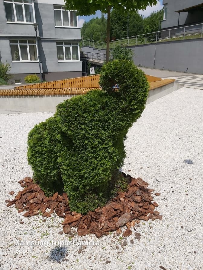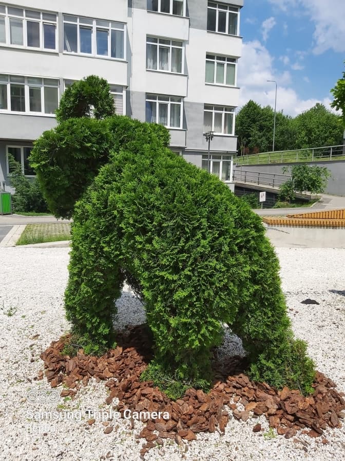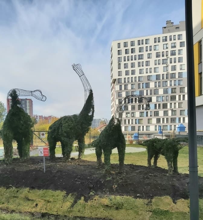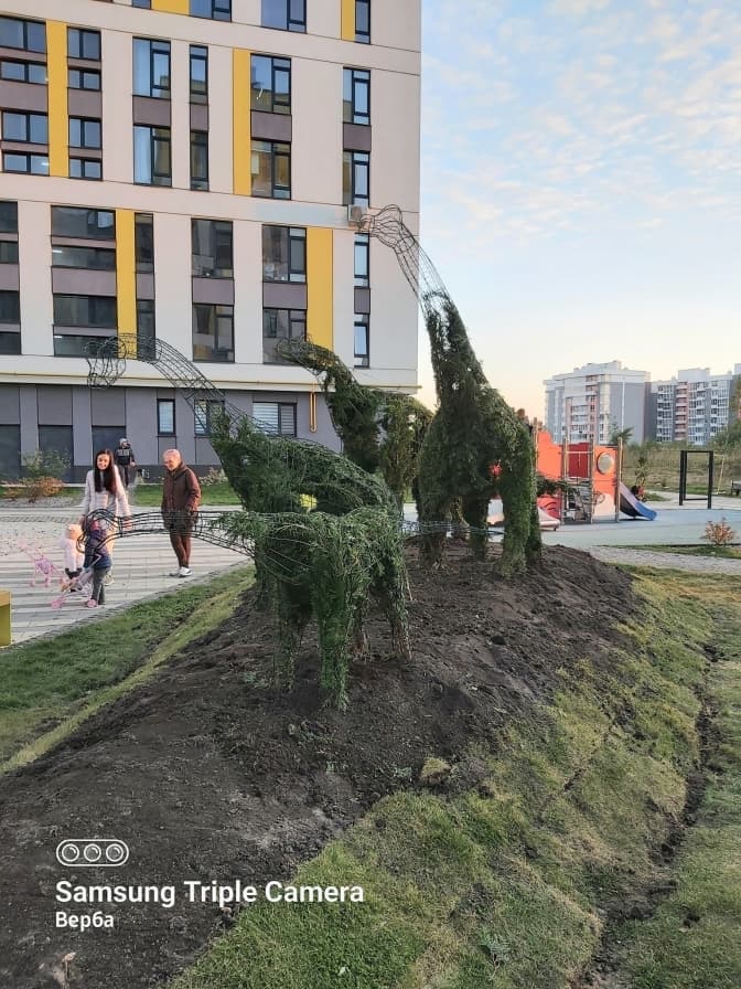 Мешканці багатоповерхівки на вул. Пасічній у Львові створили оригінальний сад. На території житлового комплексу з’явилися зелені слони та динозаври, також тут висадили алеї дубів та японських церсісів і 400 цибулин крокусів. Про це повідомили на Facebook-сторінці департаменту містобудування ЛМР.