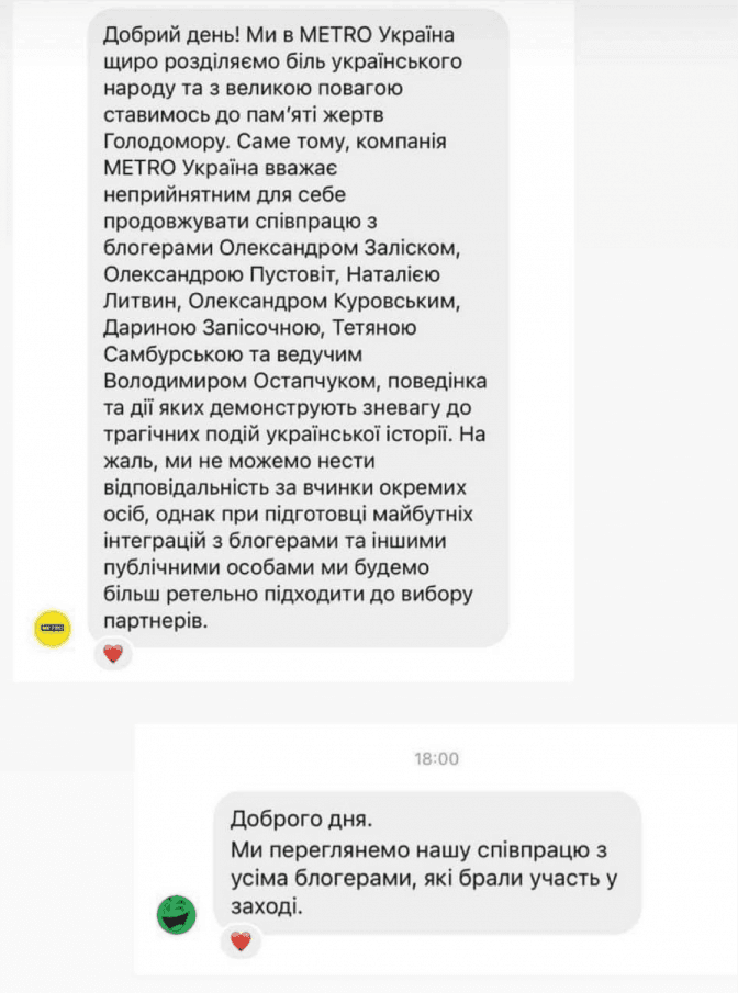 Українські мережі одне за одним почали відмовлятися від співпраці з блогерами, які були на вечірці у блогера з Чернівців Олександра Заліска у львівському Будинку вчених. Зокрема, свою позицію щодо співпраці з блогерами надалі зазначили мережі METRO Україна, Нова пошта, Київстар, Pepsi Україна, Jysk та Rozetka.