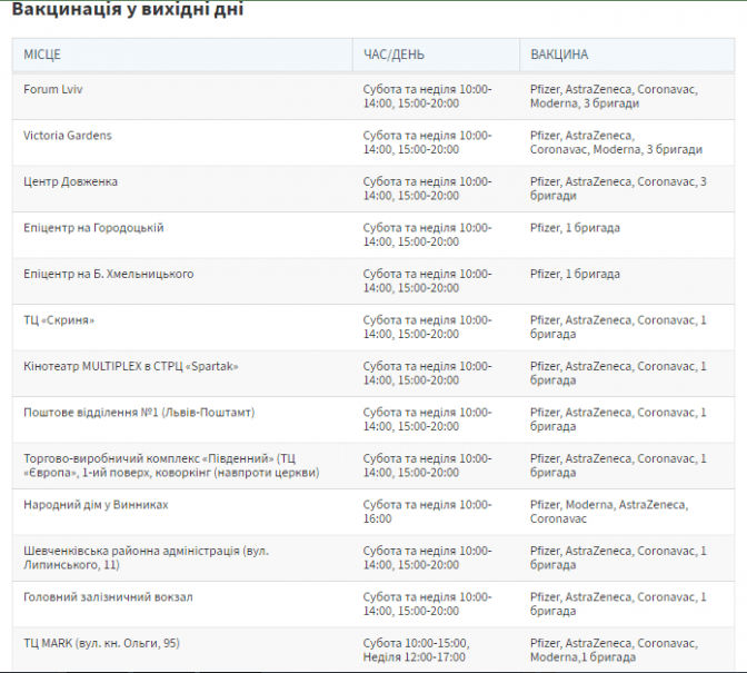Нагадаємо, у Львові довше працюватимуть майже усі пункти вакцинації, як у будні, так і у вихідні. Відтак, вони будуть функціонувати з 10.00 по 20.00. Продовження робочого дня не стосується лише пункту на Нижньому Шуварі та пункту у ТЦ «MARK», адже там передбачені інші години роботи.