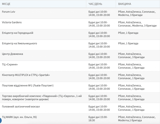 Нагадаємо, у Львові довше працюватимуть майже усі пункти вакцинації, як у будні, так і у вихідні. Відтак, вони будуть функціонувати з 10.00 по 20.00. Продовження робочого дня не стосується лише пункту на Нижньому Шуварі та пункту у ТЦ «MARK», адже там передбачені інші години роботи.