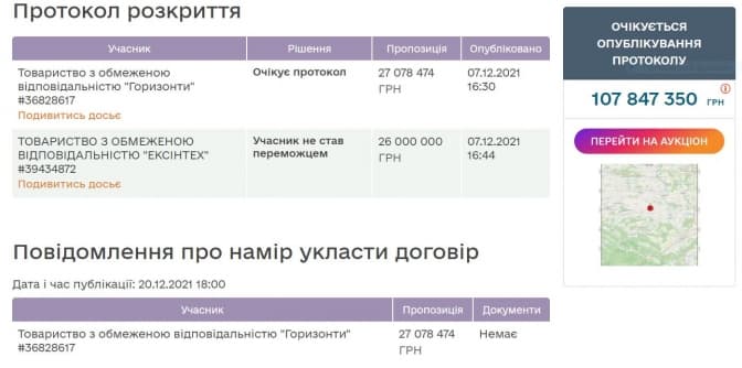 В аукціоні взяли участь дві компанії – ТзОВ «Ексінтех» та ТОВ «Горизонти». Перша запропонувала 26 мільйонів.