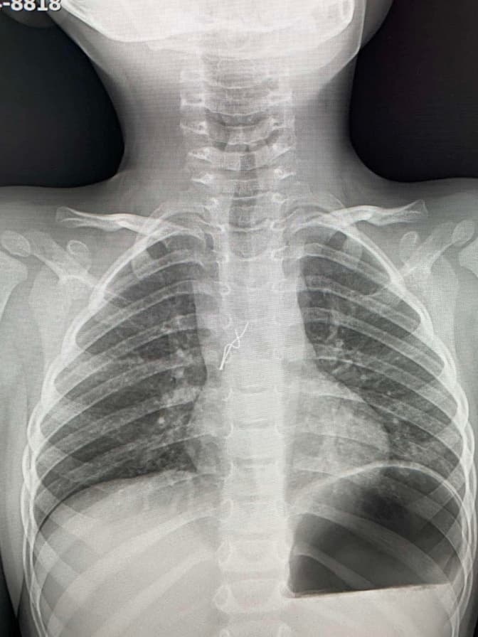 Чергові лікарі зробили рентгтен і побачили стороннє тіло у дихальних шляхах. Вуса лампочки травмували слизову оболонку дитини в ділянці біфуркації трахеї, там уже утворилися дрібні крововиливи. Діставали гірлянду без жодного розрізу за допомогою бронхоскопії. Зокрема, вусики гірлянди лікар захопив щипцями, завів їх у тубус бронхоскопа, щоб не травмувати бронхи і трахею під час видалення. Разом з цим тубусом лампочку і дістали.