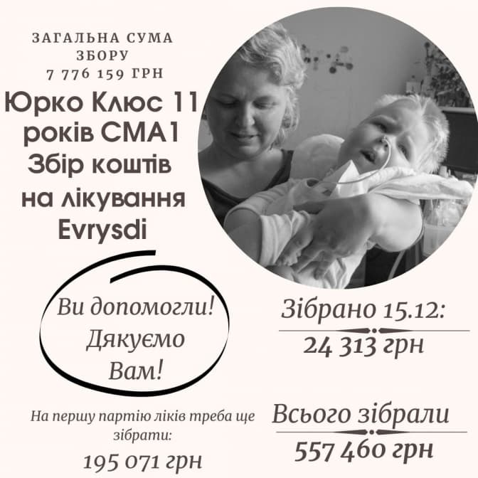 Ліки для хлопчика на рік коштують 8 мільйонів гривень. Щоб купити першу партію дорогих ліків Evrysdi для 11-річного Юрчика Клюса зі СМА, потрібно ще 195 071 грн. Загалом, на рік лікування потрібно 7 млн 776 тис. 159 грн. Ліки допоможуть хлопцеві не лише почуватися краще, а й відновити рухи.