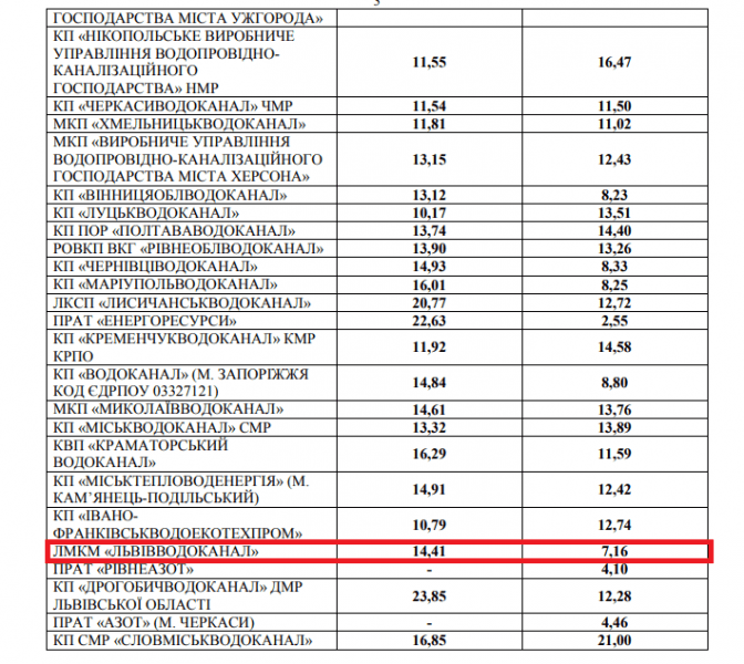 Так, тарифи для ЛМКП «Львівводоканал» на 2022 рік на водопостачання становитиме 14,41 грн за 1 куб. метр (без ПДВ) та на водовідведення – 7,16 грн за 1 куб. метр (без ПДВ). Попередня ціна була 18 грн 89 коп, тобто тариф зріс на 14%.