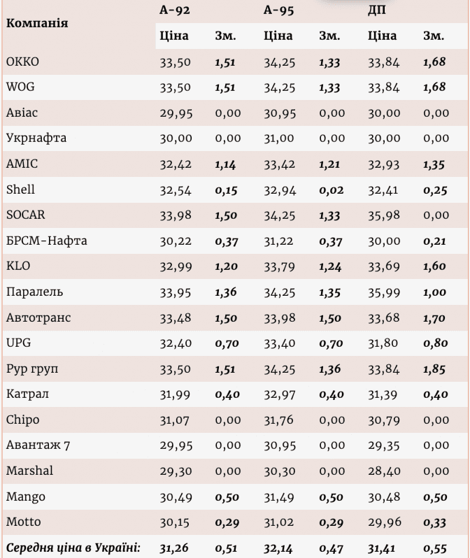 На автозаправних станціях «WOG» і «ОККО» бензини марки А-92 і А-95 здорожчали на 1,33-1,51 грн/л, до 33,50 і 34,25 грн/л відповідно. При цьому дизельне пальне в цих мережах додало 1,68 грн/л, до 33,84 грн/л. Мережі Shell, «БРСМ-Нафта», «Паралель», «Автотранс», UPG, «Автопорт» й інші підвищили ціни на пальне в межах 0,3-1,85 грн/л.