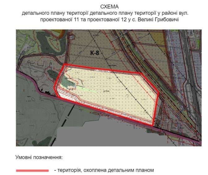 Також ухвала надає дозвіл на розробку детального плану території у районі вулиць проєктованої 11 та проєктованої 12 у Великих Грибовичах площею 25 га. Його ще виноситимуть на громадське обговорення.