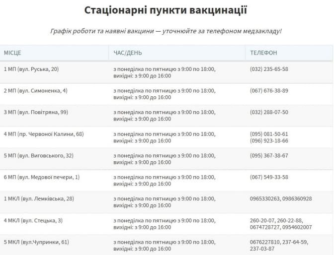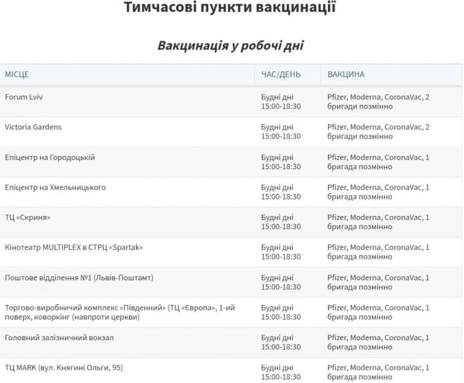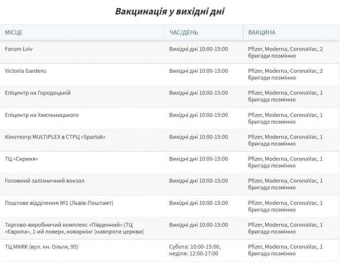 Графік роботи центрів вакцинації у Львові на цей тиждень