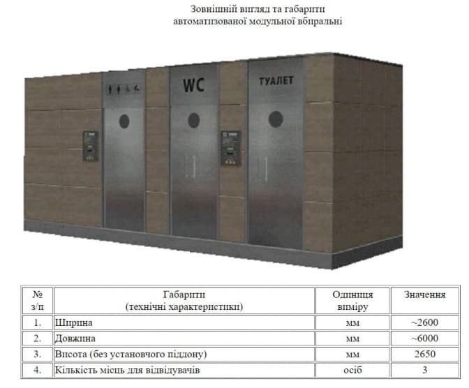 У закупівлі вказано, що модульна вбиральня має мати одну кабінку для відвідувачів з обмеженими фізичними можливостями та батьків з немовлятами, дві кабінки звичайного типу та кабіни для обслуговування.