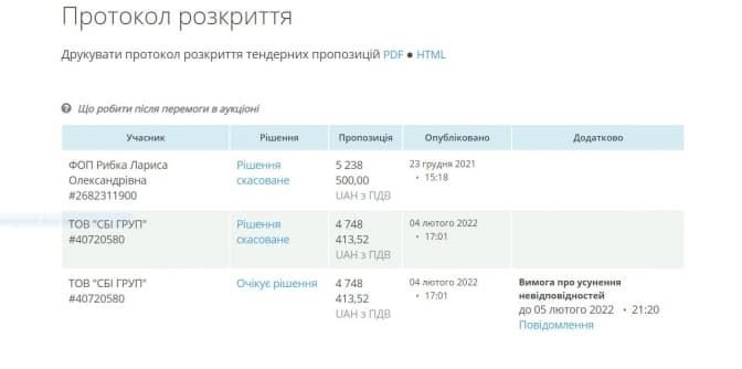 У тендері на закупівлю автоматизованої вбиральні взяли участь два учасники. Підприємиця з Дніпра Лариса Рибка, яка за даними з аналітичної системи УouСontrol займається роздрібною торгівлею поза межами магазинів, пропонувала встановити модульну вбиральню у Львові за понад 5 мільйонів 200 тисяч . А також ТОВ «СБІ ГРУП», воно також зареєстроване у Дніпрі, основний вид діяльності – будівництво житлових і нежитлових будівель, дав меншу ціну – понад 4 мільйони 700 тисяч гривень. Компанія належить мешканцю Дніпропетровської області Дмитру Кузубу. Найімовірніше після уточнень договір укладуть із ТОВ «СБІ ГРУП».