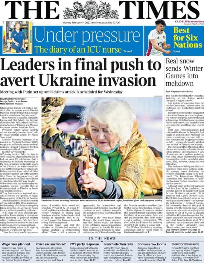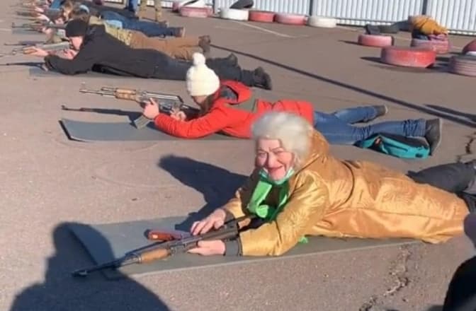Британське видання The Times опублікувало матеріал про підготовку України до можливого російського вторгнення. На першій шпальті – фото 79-річної української пенсіонерки Валентини Константинівської з Маріуполя, яка проходить базовий курс з поводження зі зброєю, готуючись до спротиву наступу з боку Росії.