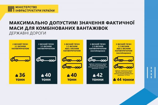 Так, згідно з новими нормами, максимальну фактичну вагу для двовісного вантажного автомобіля встановили на рівні 18 тонн, 3-осьового – 25 тонн, 4-осьового – 32 тонни.