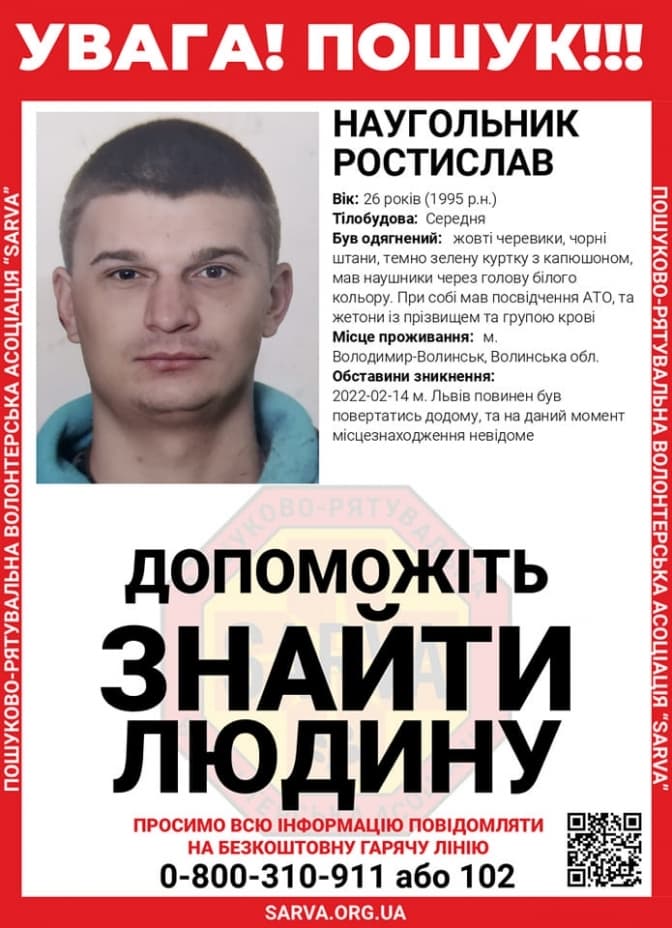 У Львові розшукують 26-річного Ростислава Наугольника, місцезнаходження якого невідоме від початку тижня, з 14 лютого. Про це повідомляє Пошуково-рятувальна волонтерська асоціація.