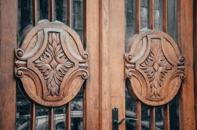 Для давньої дубової брами майстри виготовили нову дверну ручку, зняли всі нашарування фарби, виконали вставки. Крім того, фахівці відновили втрачену частину різьби, виїмчастих і звичайних вікон. Щоб було видно природну структуру дерева, двері не фарбували, а затонували та покрили водостійким лаком.