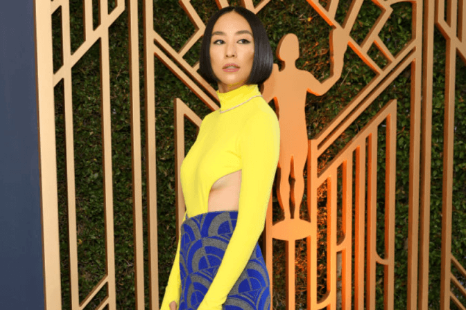 Зірка серіалу «Ранкове шоу» Грета Лі з’явилася на церемонії у жовто-блакитній сукні, що символізує прапор нашої держави.