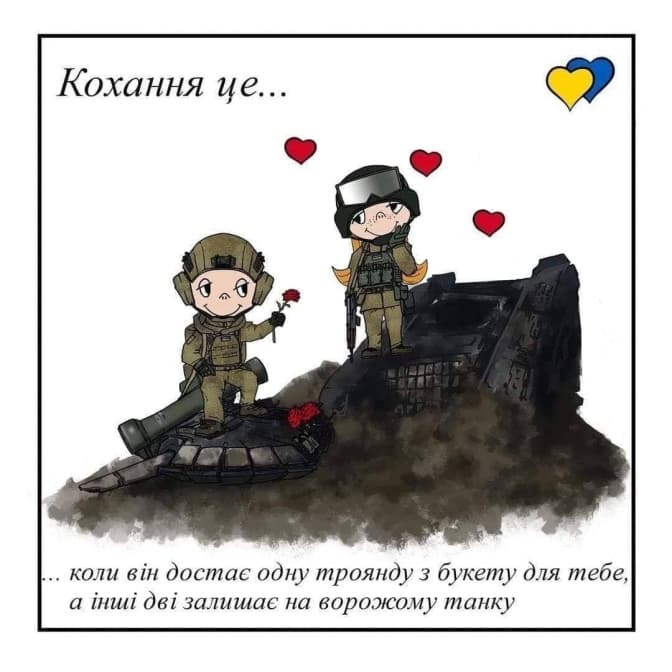 Після розгортання повномасштабної війни російського агресора проти України, атак ворога і перемог українського війська українці не зневірилися, а навпаки знайшли сили об’єднатися та шукати сили для боротьби. Нещодавно у соціальній мережі Фейсбук з’явилися цікаві картинки із серії «Кохання – це…».