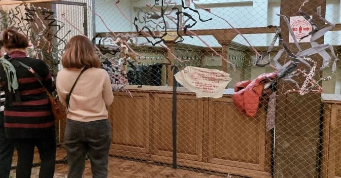 На сітці, яка стала реквізитом вистави, вишили напис на клаптику обірваної тканини.