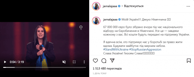 «67 000 000 євро було зібрано вчора під час національного відбору на Євробачення в Німеччині. Усе це — завдяки кожному з вас. Всі кошти будуть передані на підтримку України. Я вдячна всім, хто підтримує нас у боротьбі за право жити вдома. Будувати майбутнє під мирним небом. Слава Україні! Героям Слава!», – написала вона в Instagram.