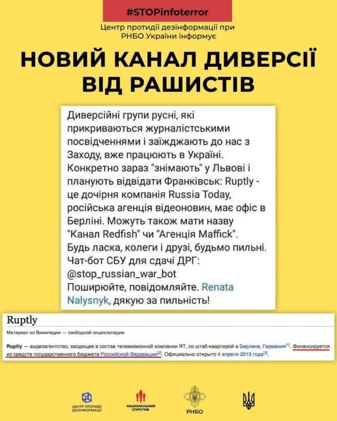 «На цей раз окупанти знайшли «лазівку» з боку Європи. Вони засвідчують до нас із посвідченнями журналістів відеоагентів Ruptly, а це – дочірня компанія агентства Russia Today. Російська агенція відеоновин має офіс у Берліні. Можуть також мати назву «Канал Redfish» чи «Агенція Maffick», – зауважують в РНБО.