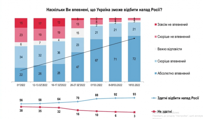 Віра у перемогу України над російськими загарбниками залишається на найвищому рівні – 93% опитаних вірять у те, що Україна зможе відбити напад ворога. Впевненість у перемозі переважає в усіх регіонах країни. Про це свідчать результати опитування соціологічної групи «Рейтинг», яке проводили 18 березня.