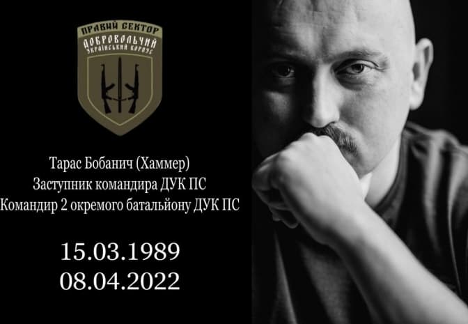 13 квітня у Львові поховають командира 2-го батальйону ДУК «Правий сектор» Тараса Бобанича, друга Хаммера, який загинув у бою з окупантами. Про це йдеться у повідомленні 2-й окремий батальйон ДУК ПС.
