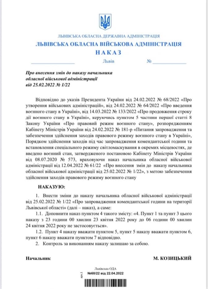 Комендантську годину у Великодню ніч, з 23:00 23 квітня до 6:00 24 квітня, скасували. Про це повідомив голова Львівської ОВА Максим Козицький та оприлюднив відповідний наказ.