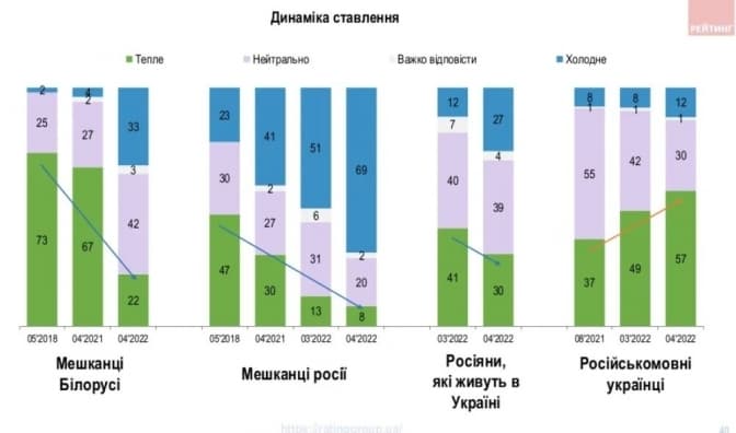 До жителів Білорусі позитивно ставляться лише 22% (за рік показник погіршився втричі), негативно – 33%, нейтрально – 42%. Водночас до жителів росії переважає негативне ставлення – 69%. Позитивно ставляться до них 8% (протягом року показник погіршився більш ніж втричі), нейтрально – 20%.