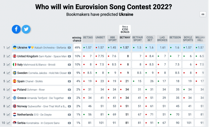 На офіційному сайті конкурсу створено прогноз переможців «Євробачення-2022». Список змінюється в залежності від оцінок фанів та спостережень букмекерів. Тривалий час у таблиці тріумфувала Італія. Україні ж пророкували 5–6 місце. Утім, вже понад два місяці прогноз незмінний: переможець – Україна.