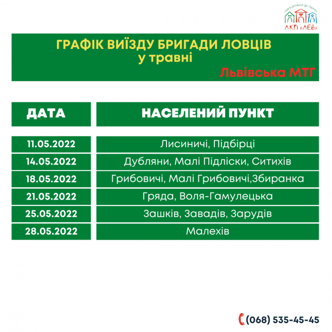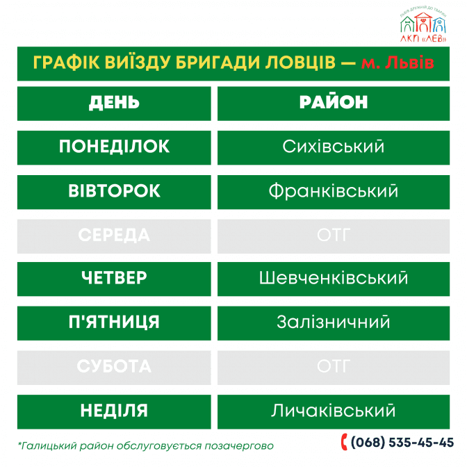 Виїзд бригади відбувається виключно за телефонним запитом на номер: 068 535 45 45. ЛКП «Лев» працює щодня, без вихідних, з 8:00 до 19:00 год. на вул. Промисловій, 56.