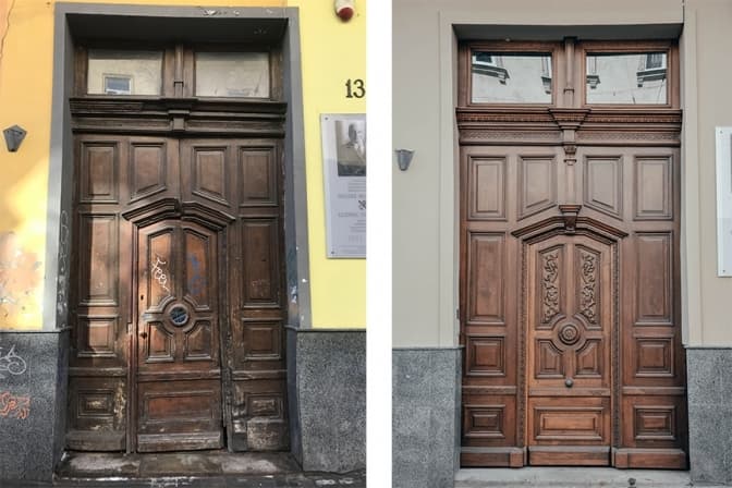У центрі Львова, на вулиці Гнатюка, 13, відреставрували дерев’яні двері. За відновлення дверей майстри взялися ще до початку широкомасштабного вторгнення росії. Так, в процесі роботи відремонтували автентичні металеві механізми фіксації дверей, які рідко трапляються у львівських брамах. Про це повідомила пресслужба ЛКП «Бюро спадщини».