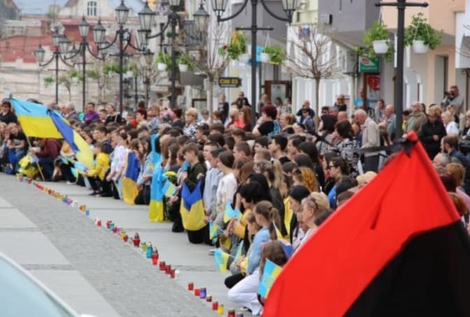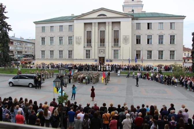 На колінах, з державною символікою та лампадками в руках, під звуки «Плине кача» громада міста віддала останню шану захиснику.
